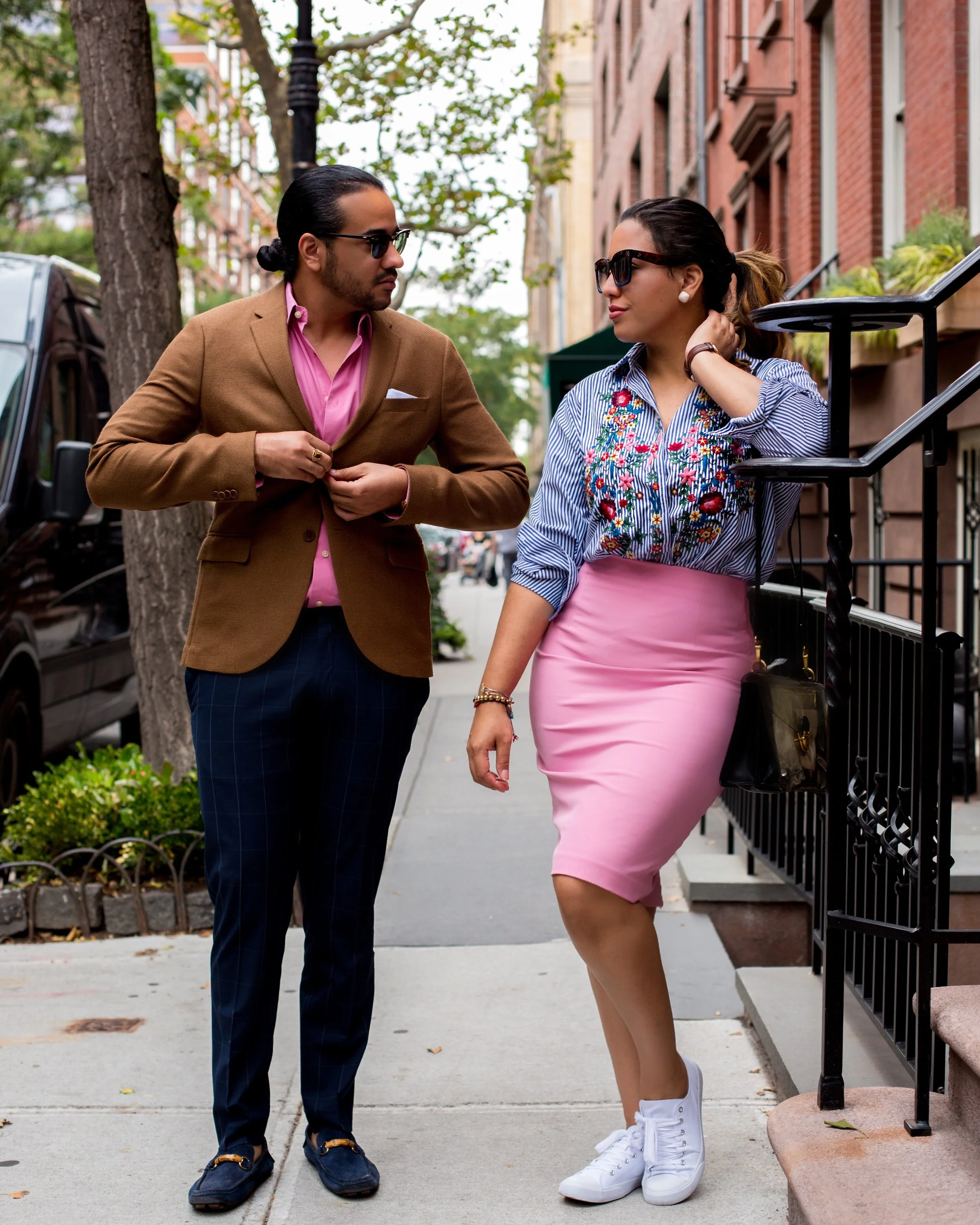 Rosanna: Algo que me gusta de la moda es la posibilidad de romper las reglas, por ejemplo: esta falda lápiz con tenis básicos blancos, anteriormente era impensable para un estilismo de street style, sin embargo, estos elementos mezclados evocan lo mejor de la feminidad y la comodidad, y si, quizás suene paradójico especialmente para nosotras que somos amantes de los tacones pero todo está en la actitud, obviamente escogí la falda en mi color favorito ROSADO la cual mezcle con otro elemento que incluí en este look romántico casual, la camisa azul de rayas (Must Have) que aunque en un principio nos da aire masculinos o laborales cuando tienen detalles como en este caso bordados en la parte frontal puedes llevarla de forma más girly ¿Mucho romanticismo, no? así es, al parecer estos detalles ultra femeninas con onda vintage serán los protagonistas en las próximas temporadas ¿Será que el lady like estará on top? De ser así, yo estaré feliz, ustedes saben con lo que me gusta a mi ese estilo, creo que en mi es el predominante.