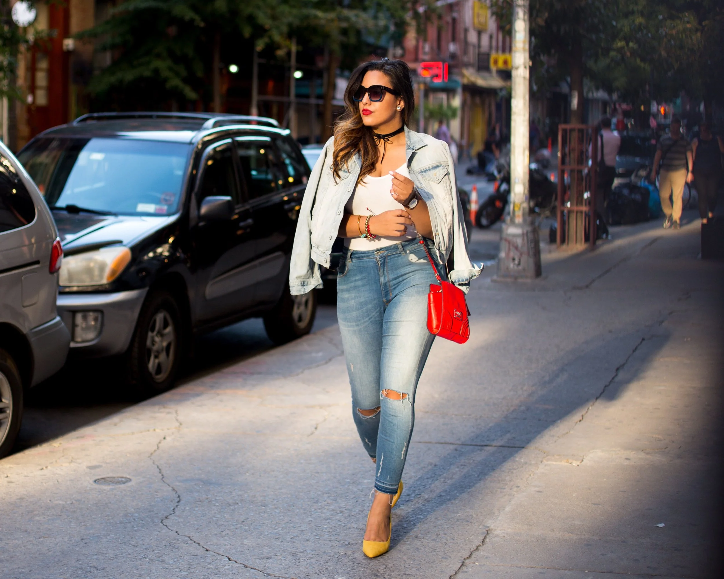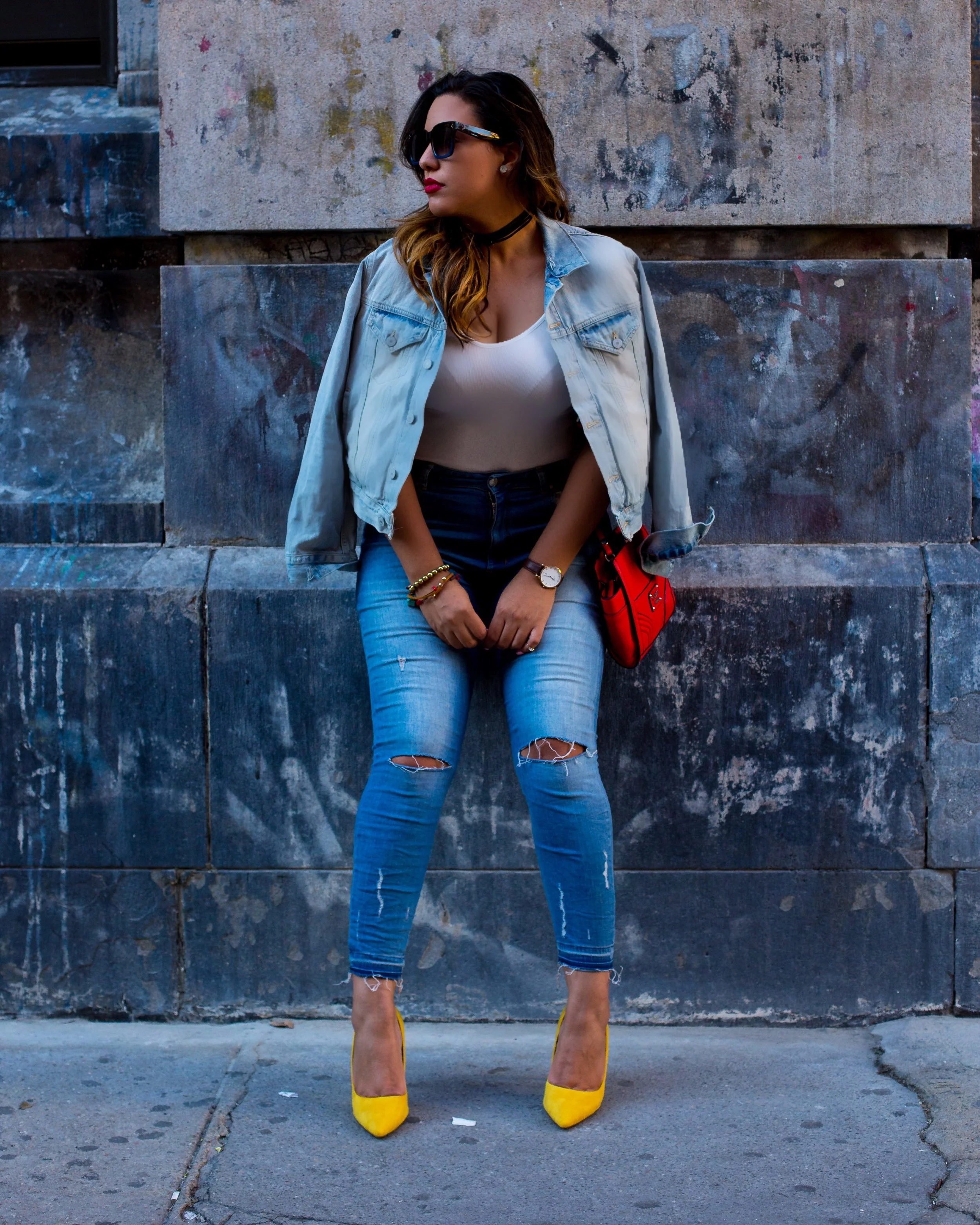 Rosanna: yo soy súper súper súper Lady like, sin embargo para una reunión en el centro con algunos amigos quería algo más comodo así que un duo light denim con un toque divertido entre el bolso rojo y mis zapatos amarillo fue una buena elección, ahhh eso si, mis stilettos no los iba a dejar jaja, los necesito, Sorry. También puedes agregar estampados o llevar la atención con unos lente de sol fabulosos o el color en los labios. Tu estilo personal es algo que debes representar en todo momento y ante cualquier situación, no es algo que cambias, siempre va contigo.