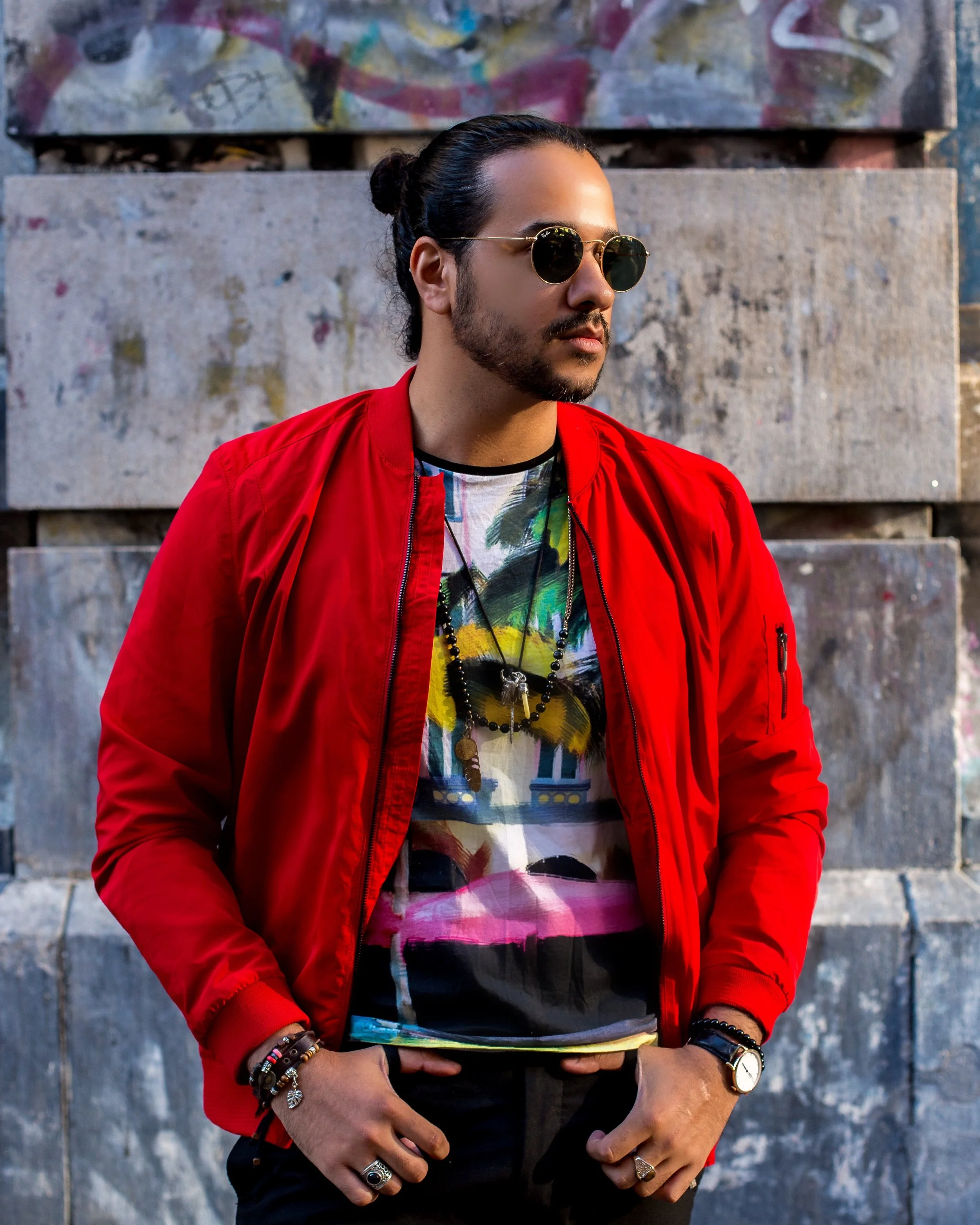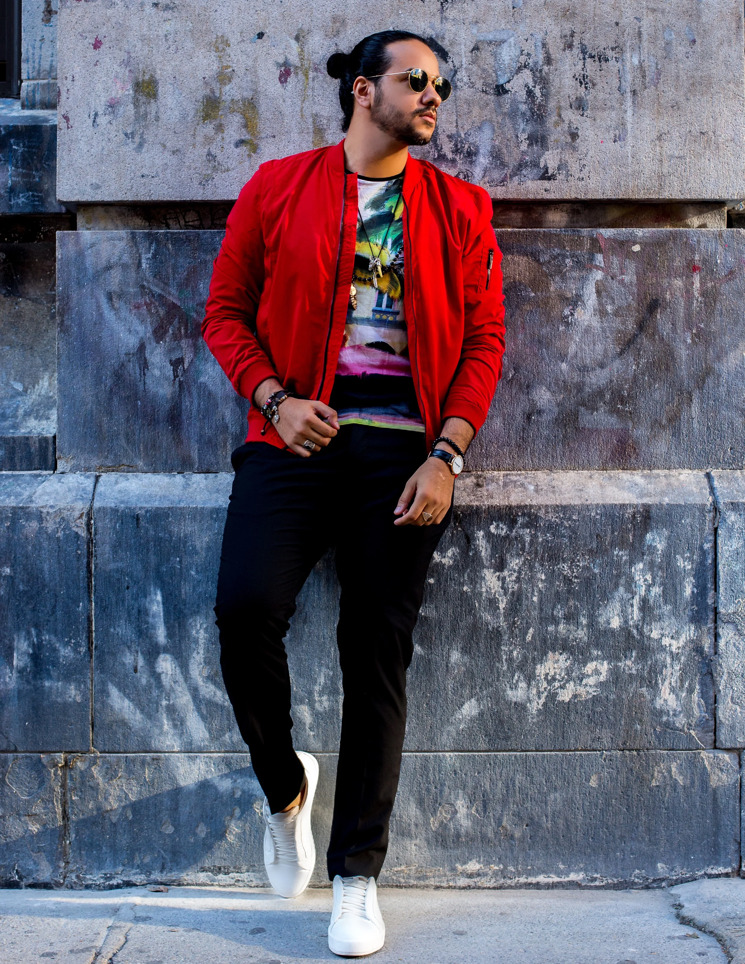 Winston: si, los dapper también vamos al mall y si también vamos al MCDonalds, come On! No es que andamos 24/7 en suit, tenemos la capacidad de variar un poco siempre dentro de nuestra filosofía claro, en mi caso decidí llevar un bomber rojo, con white sneakers y T shirt con gráficos, algo bien 90’s de hecho creo que los 90’s fueron la época más casuales y el origen de lo que hoy conocemos como piezas de ese estilo así que decidí inspirarme en ellos para crear este look, algo que definitivamente pienso que no debe faltar en un Outfit “comodo” son los denim jeans y los lentes de sol, el hecho de que estés cómodo no quiere decir que vayas a olvidarte de verte siempre punta en blanco, Looks como este puedes usar para el cine con la familia o para un día muy ocupado de compras.