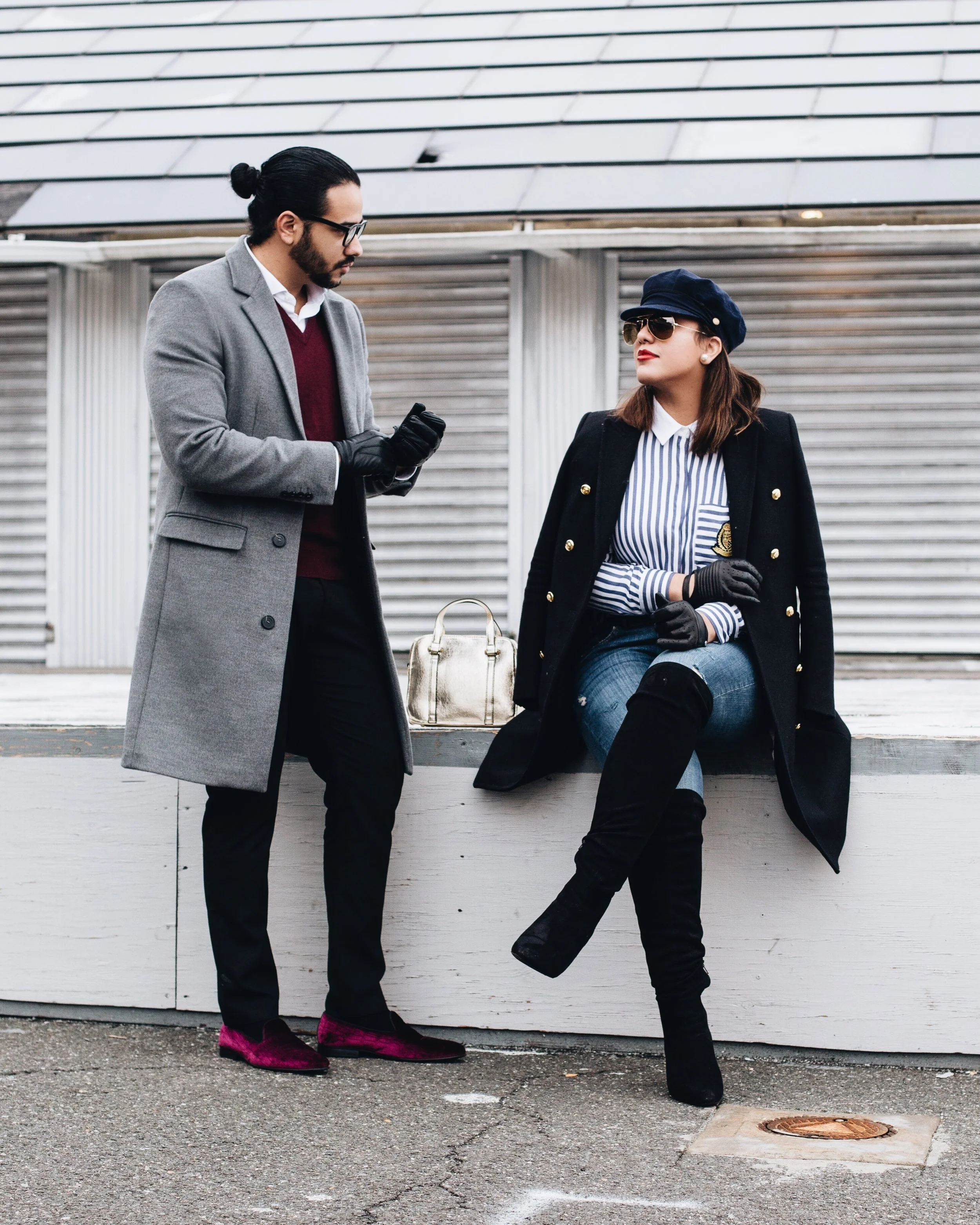 Lo primero que tuve muy claro desde el principio es que los cortes vaporosas y textiles suaves no entrarían en este juego y es que con el intenso frio que hace acá no sería posible sobrevivir, los shorts y sombreros de alas anchas no estarían acompañándome en esta locura así que solo me quedaba inspirarme en colores, estampados y concepto para un look náutico en pleno invierno, esto de los colores no fue muy difícil y es que el azul marino es un color neutral que dependiendo el tono con que lo mezcles tendrá un excelente resultado en cualquier estación, pero bueno aquí les explico un poco más del look; Camisa a rayas en azul grisáceo y blanco, combinado con jeans prelavados, coat de botones dorados y botas altas (Pieza básica de la temporada) un sombrero marinero no hubiese sido muy viable así que lo cambie por una boina con detalles marinos armonizando con aretes en perlas (De mis favoritos).