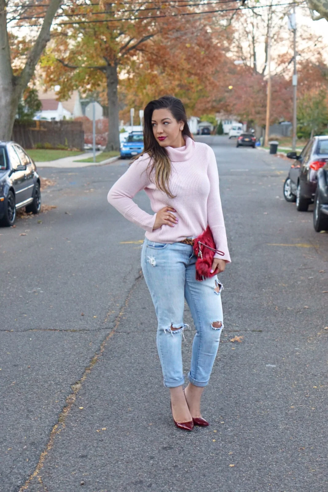En este caso decidí retomar este look pero cambiándole un poco el estilo, algo más casual ripped jeans en light blue que hace un súper contraste con el vintage pink de mi suéter, un poco de textura no cae mal verdad? Bolso marsala y stilettos que siempre van bien con este tipo de jeans, no podía dejar pasar esta oportunidad para usar esta correa en animal print de leopardo. Se los confieso para mí esta combinación y el animal print de leopardo fueron creados el uno para el otro.