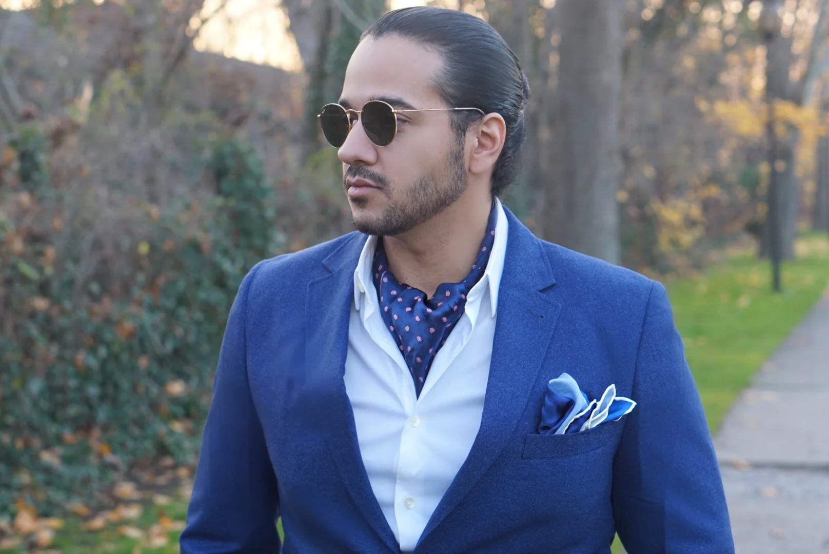 Winston as always true to his aesthetic mixed three colors: baby blue, navy blue and serenity. Accessories came in a shade of brown with reddish under tone for his shoes and belt, which makes a perfect balance in the interplay of cool colors during the fall. Details such as a silk ascot and bicolor pocket square helped create a quite relaxed look without losing its dapper elegance.