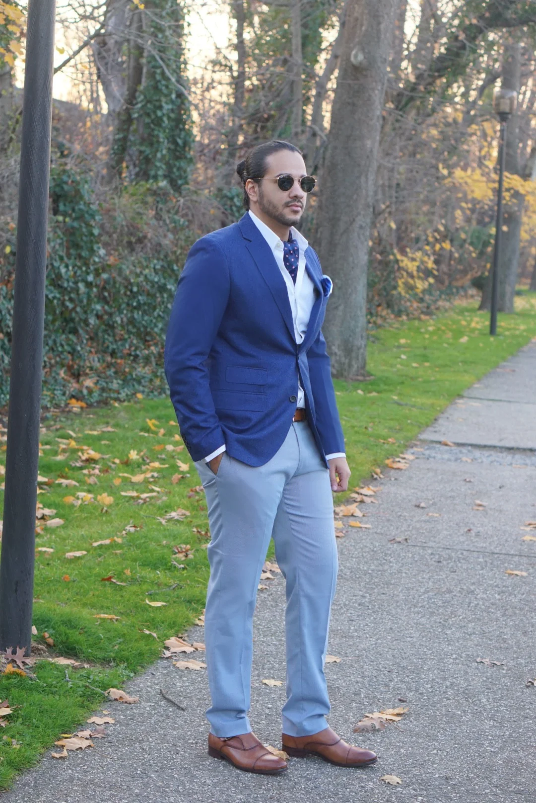 As a classic Man whom I always consider myself, I start by contrasting traditional shades such as the navy blue blazer and my dark brown pants, which are a foolproof formula for many occasions. And then after comes the trendy part, where I opted for a horizontal striped shirt in baby blue due to its popularity amongst Men fashion runways the last few seasons. In order to make your blazer stand out, use accessories that compliment your blazer such as a lapel pin, a pocket square or in my case be bold and wear both. I even suggest trying color shoes; for this outfit a pair of radiant orchid would finalize and make a statement that says I’m here. Don’t be afraid to mix trends and create your our own classic “Dapper Look”.
