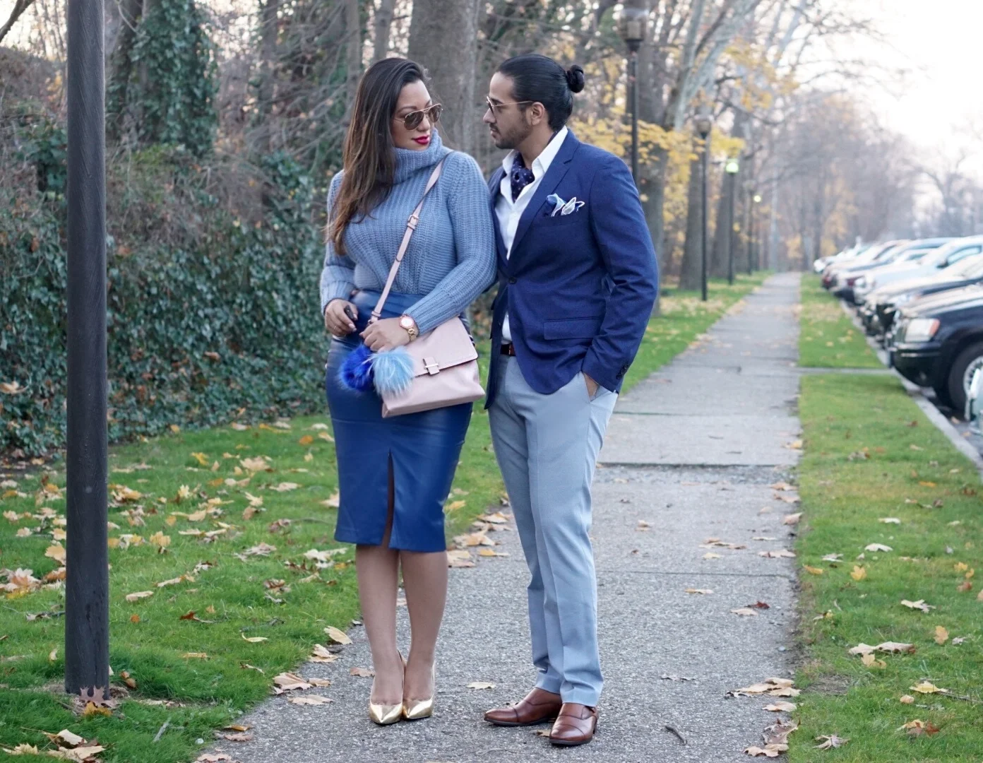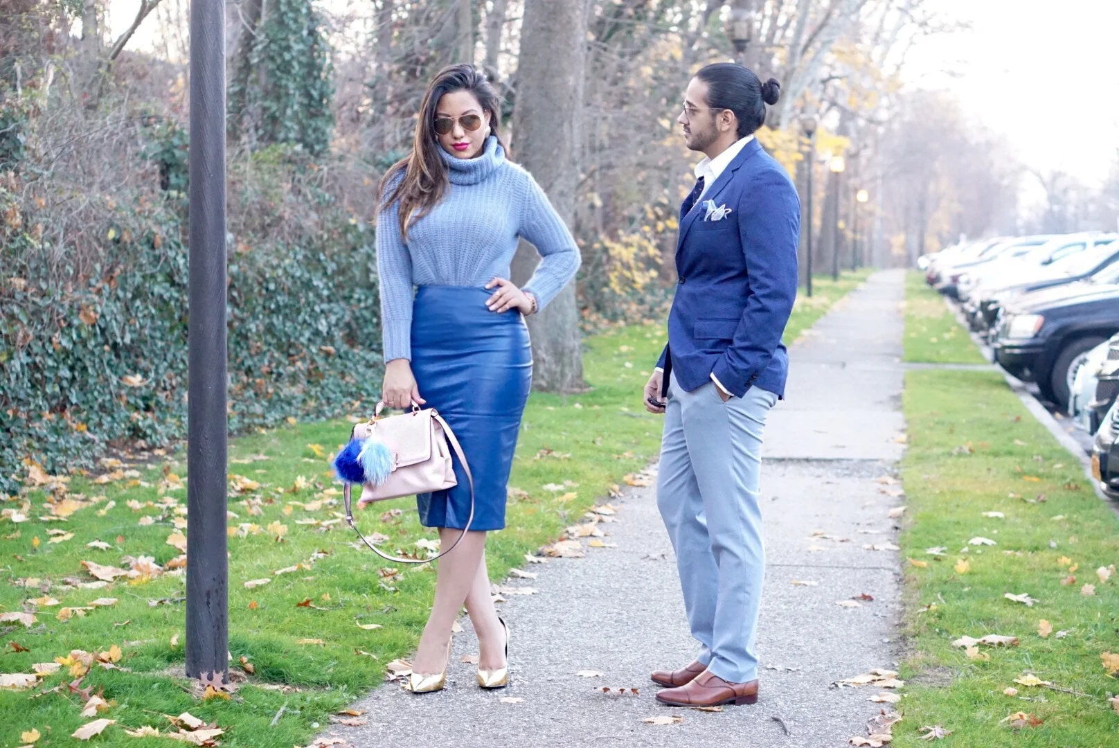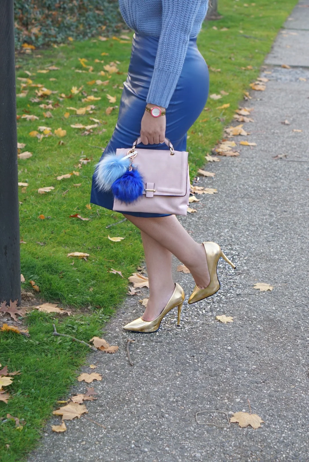 Pero vamos a lo que vinimos: decidimos armar estos looks con diferentes tonalidades y mezclando texturas, en mi caso me fui por un lady like moderno con aires de invierno, confieso que amé mi falda en leather en azul marino, opté por utilizarla con un suéter en serenity blue que evoca la época más fría del año y para darle el toque final un mini bolso en rosa cuarzo (este color será mi uniforme en 2016, lol) por supuesto mis divertidos pompones no podían quedarse los cuales matizan súper bien con los clásicos stilettos dorados.