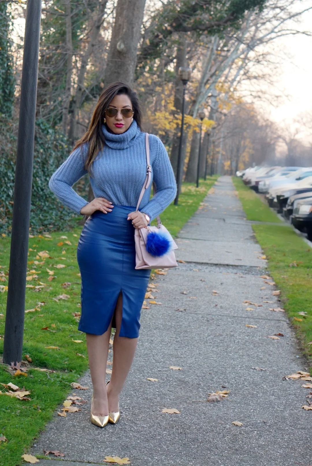 Now let's talk about Serenity: We decided to put together these looks with different shades and a mixture of textures. In my case, I went for a modern winter breeze look. A leather skirt in true blue paired with a heavy sweater in Serenity blue that evokes the coldest time of year. To put the finishing touches I opted for a mini bag in Rose Quartz (this is the second color chosen by Pantone for 2016) with my funny pompoms of course and to finish really well a pair of classic stilettos.