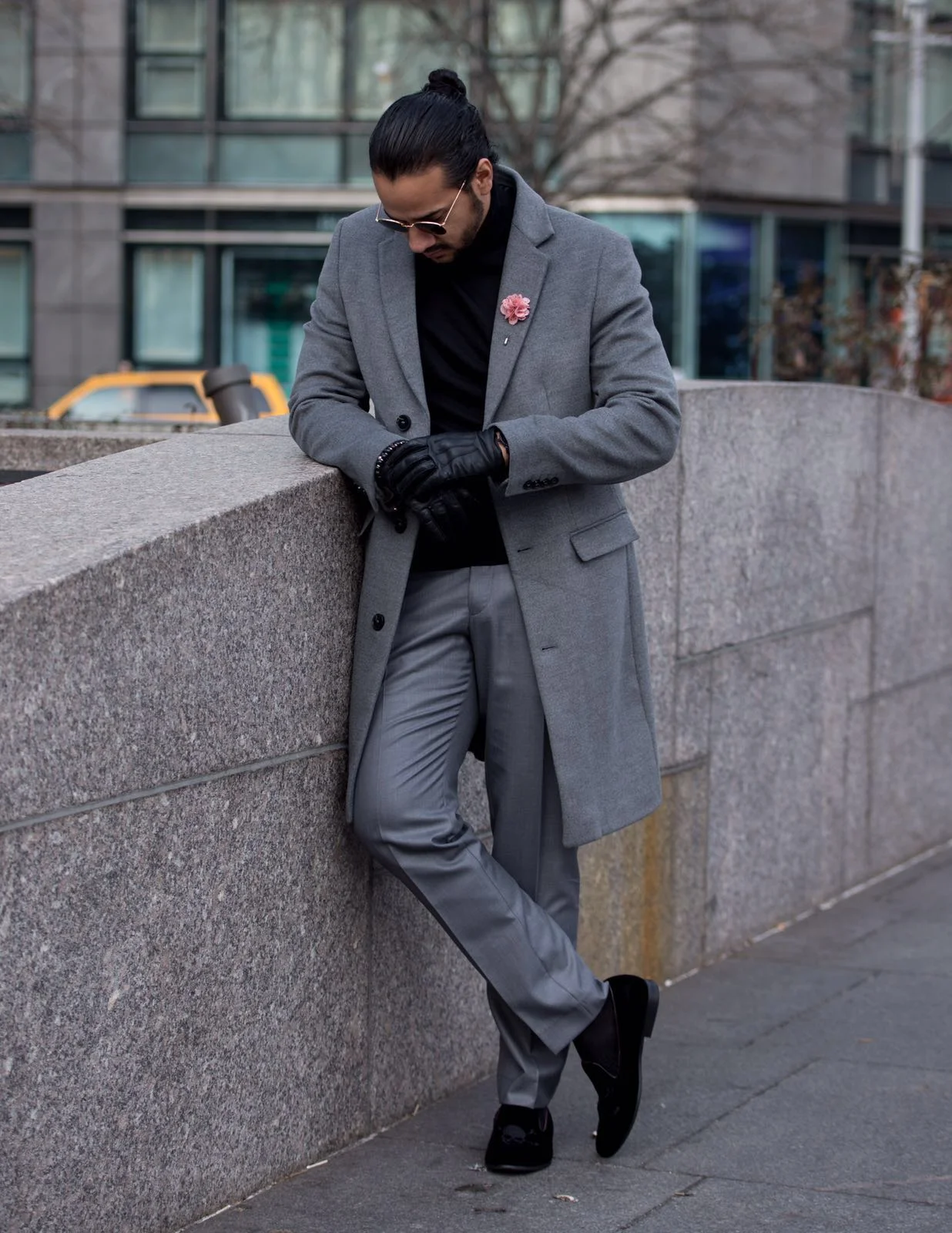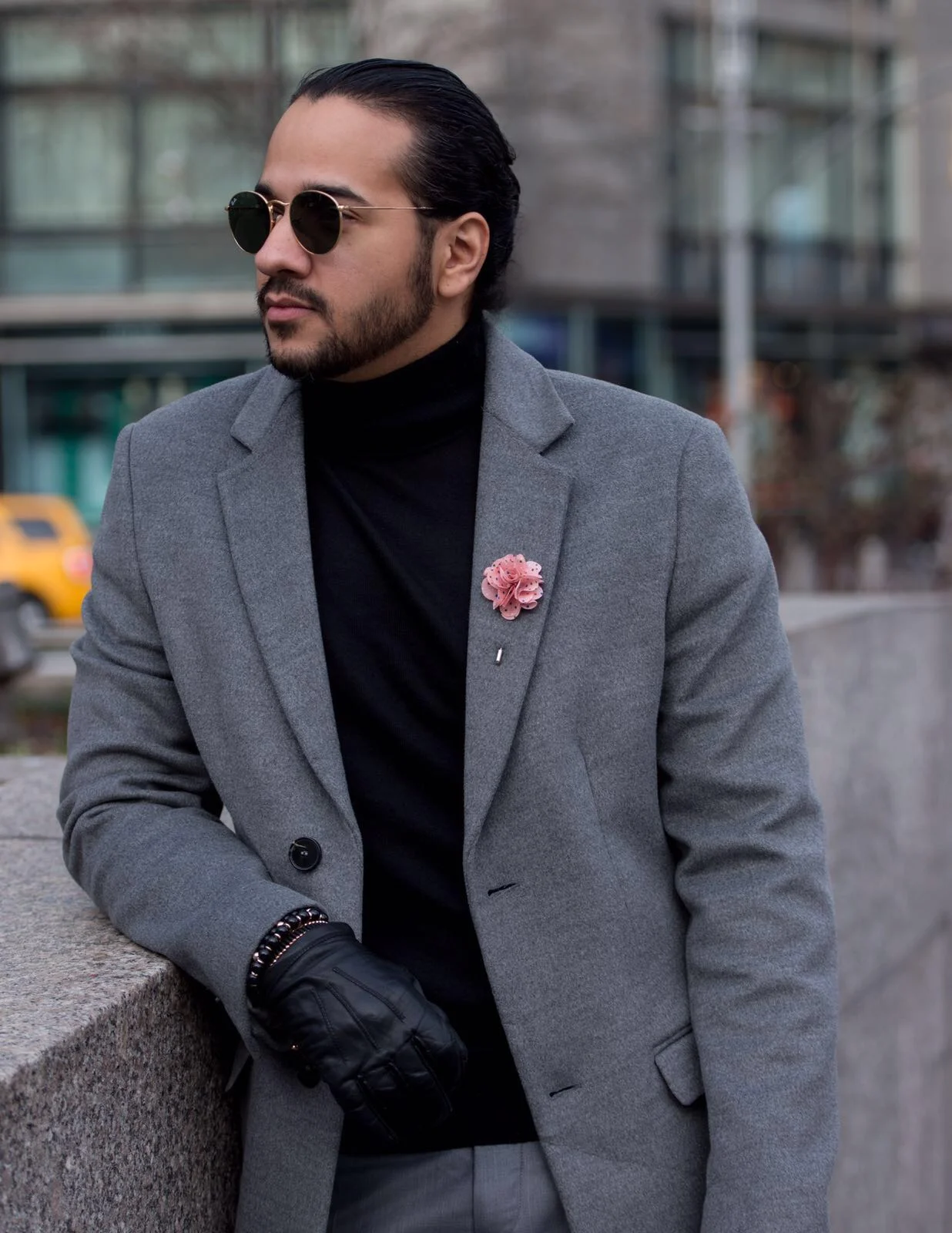 Within the masculine aesthetic there’s none more elegant than a velvet blazer, nowadays it has become an emblem of the modern gentleman. I honestly don’t think there is a New Years look that’s complete without it. For this look, I decided to accompany it with a white turtleneck sweater which goes perfect for this cold weather, paired with dress trousers in a grid pattern to balance the look and of course my favorite shoes in black suede. Something that’s never missing is an accessory piece like the silk pocketsquae in my blazer; it’s a small but very personal detail that adds a touch of care in the general aesthetics of the modern dapper gentlemen.