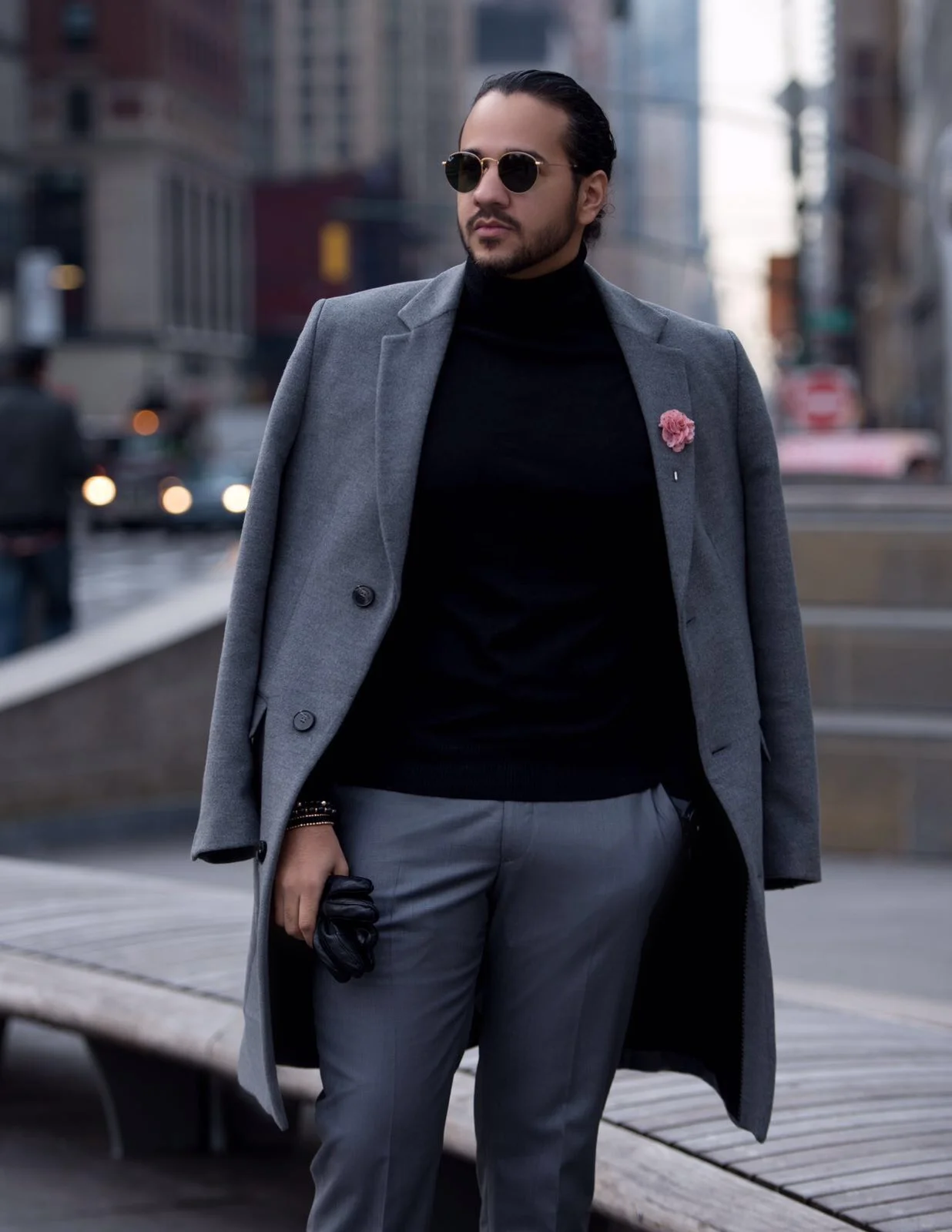 Winston: Yes, all black everything, an interesting part about monochromatic looks is the men have more wiggle room and could take more chances than women. For instance, we wear a one color suit and even match it with a similar color tie…but enough with the Dapper in me…this look is about the essence of an all dark outfit casually elegant. In my outfit, I choose damask slim cut pants, black high neck sweater, velvet black dress slippers and an wool over coat with gold bottoms.